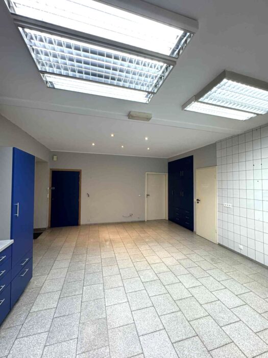 Composition (+/- 60m²) : salle d'attente de 9m², pièce principale de 27m², pièce secondaire de 10m², trois pièces stock/rangement de 5 à 3m² et 2 wc.